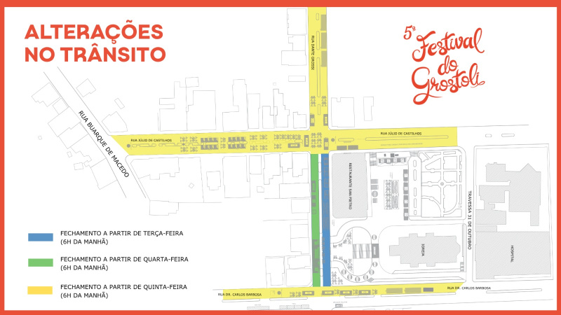 Já na quarta-feira (08), a partir das 6h, a Rua Dante Grossi terá uma nova extensão de bloqueio, desta vez, para o outro sentido da via, de quem acessa pela Rua Júlio de Castilhos em direção a Rua Dr. Carlos Barbosa.