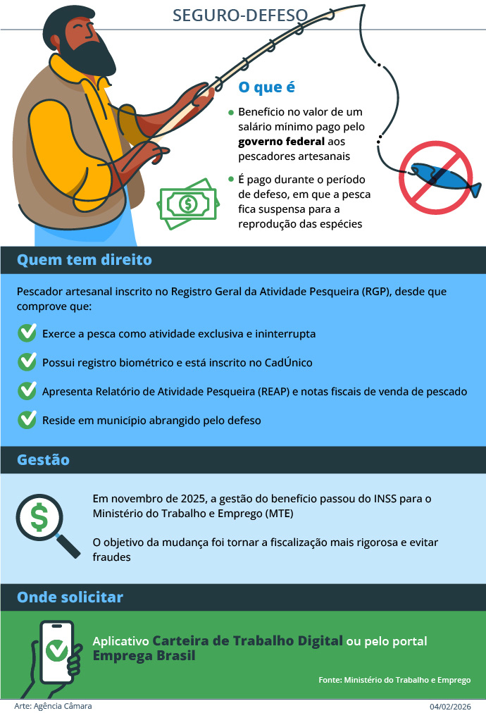 A medida provisória estabelece novas condições de cadastro e identificação para evitar fraudes no pagamento do seguro-defeso e autoriza a quitação das parcelas pendentes em 2026 se o beneficiário atender aos requisitos exigidos em lei.