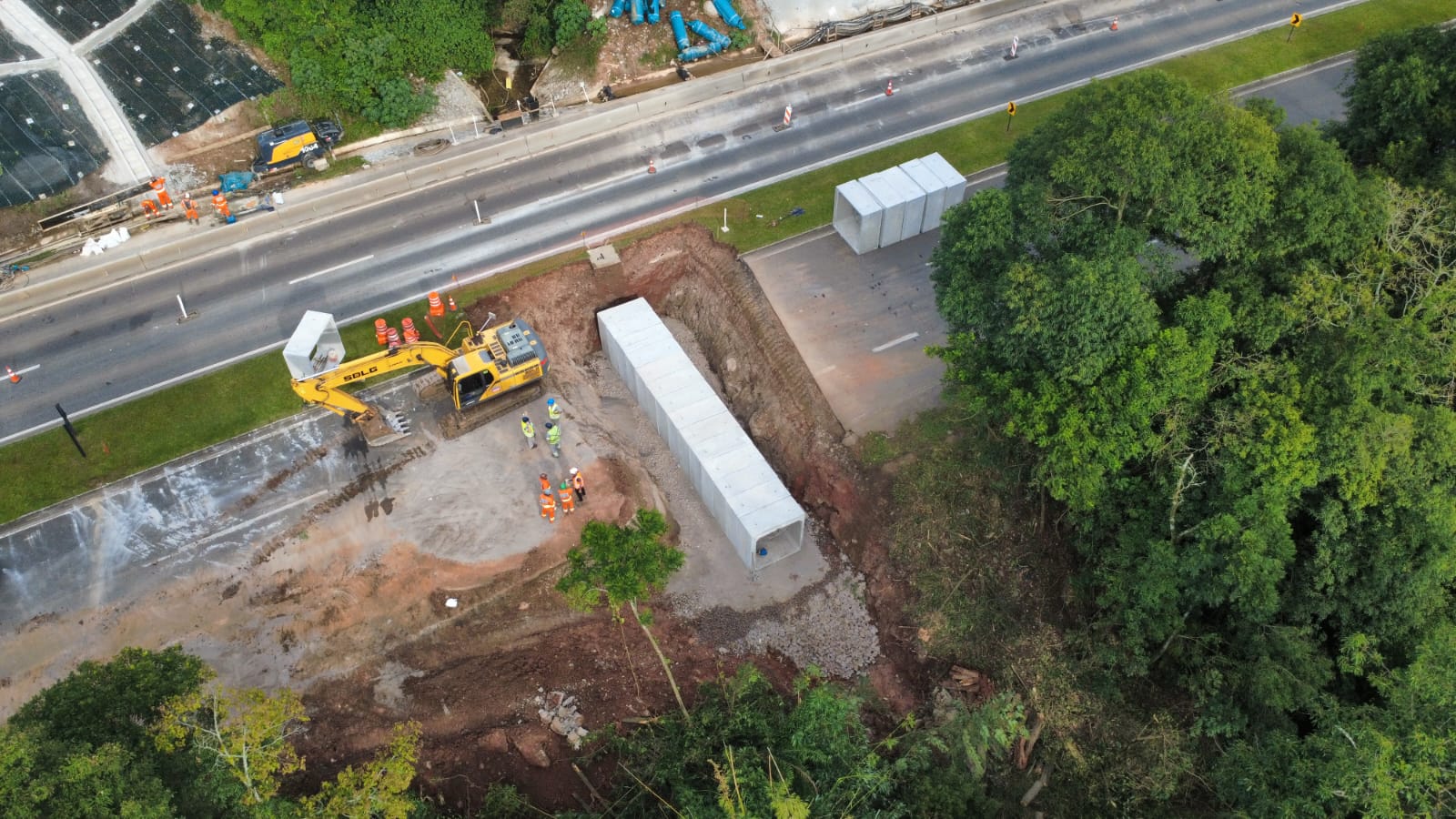 Para garantir maior estabilidade do solo e controle do escoamento da água, estão sendo executados serviços como limpeza de áreas, supressão vegetal, destocamento de árvores, terraplanagem e implantação de sistemas de drenagem. Entre as estruturas previstas estão canaletas, canais, bueiros de concreto e escadas hidráulicas, que têm a função de captar e direcionar a água de forma segura, reduzindo o risco de erosões e deslizamentos.