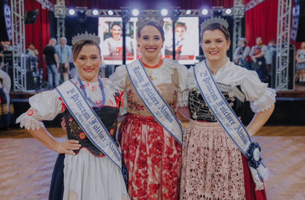 Após o anúncio dos resultados, coroação e premiação das eleitas, a Corte do Folclore Alemão 2026, formada pela Rainha Jéssica Fernanda Schaab, 1ª Princesa Olívia Nienow e 2ª Princesa Ketrin Ananda Kich conduziram a Polonaise ao som da Banda Nina.