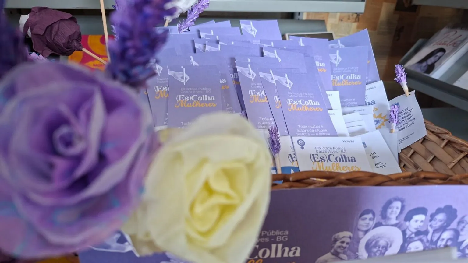 Como forma de aproximar ainda mais o público da campanha, a Biblioteca também realizou a distribuição de kits literários, compostos por materiais que incentivam a leitura e a reflexão sobre o papel das mulheres na sociedade. Os kits incluíram marcadores de página personalizados, frases e citações de escritoras, um flyer de divulgação da biblioteca e suas ações culturais, além de flores artesanais confeccionadas com papel crepom e páginas de livros descartados, simbolizando o florescimento de novas histórias e vozes femininas.