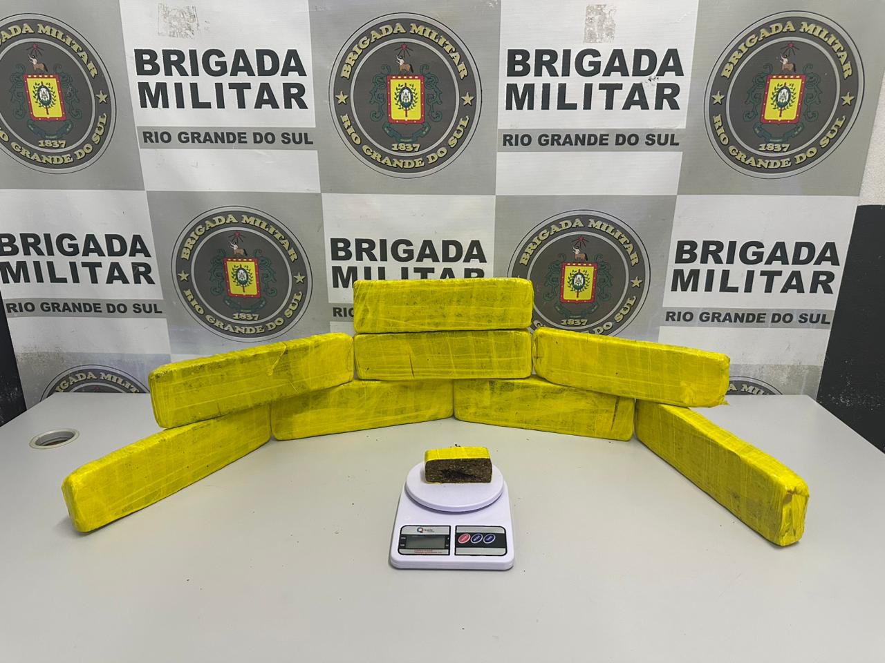 Durante patrulhamento, a equipe abordou o suspeito e, na ação, foram apreendidos 8 tijolos e um pedaço de maconha, totalizando 4,634 kg, além de uma balança de precisão.