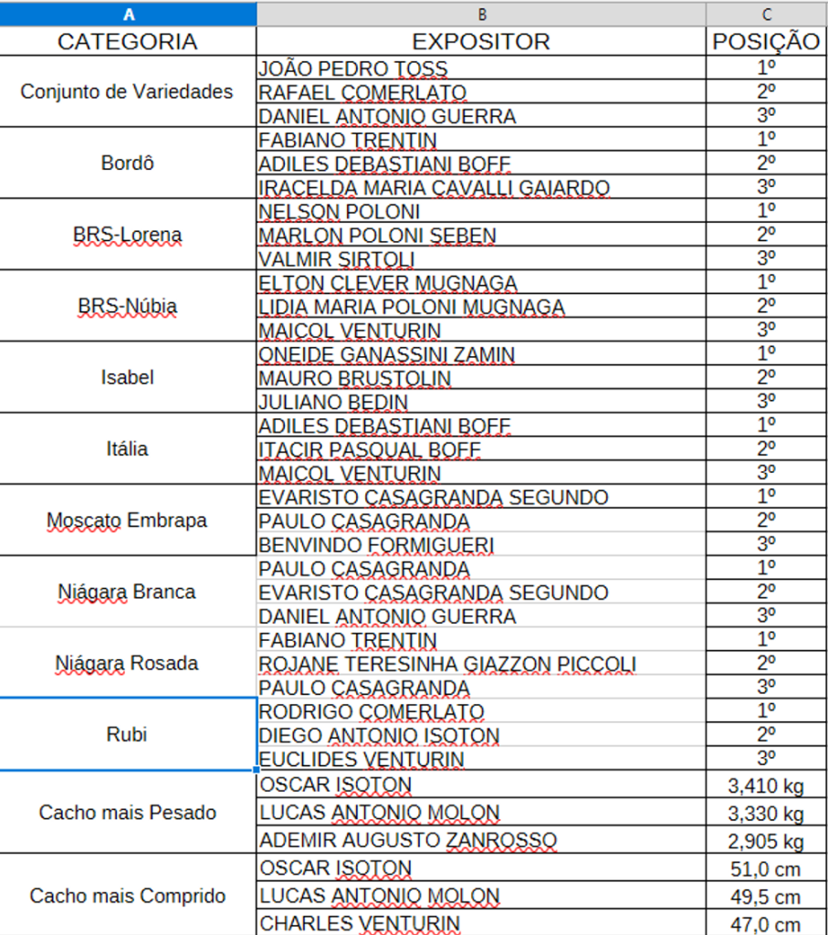 Foram conhecidos nesta quinta-feira (19.02) os vencedores da Exposição de Uvas da Festa da Uva 2026. As amostras avaliadas compõem quatro grupos: Conjunto de Variedades, Variedades Isoladas, Cacho mais Pesado e Cacho mais Comprido – sendo estas duas últimas categorias estreantes. Os vencedores vão receber seus troféus durante jantar no próximo dia 28 de fevereiro, na comunidade de Nossa Senhora da Saúde.