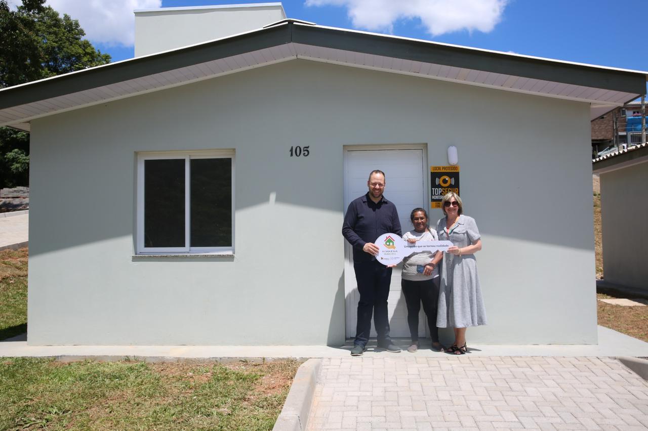 A manhã de sábado, (24), foi marcada pela entrega das chaves de cinco novas residências no bairro Alvorada, em Farroupilha, dentro do Programa A Casa É Sua, desenvolvido em parceria entre o município e o Governo do Estado. A iniciativa reforça as políticas públicas de habitação e amplia o acesso à moradia digna no município.