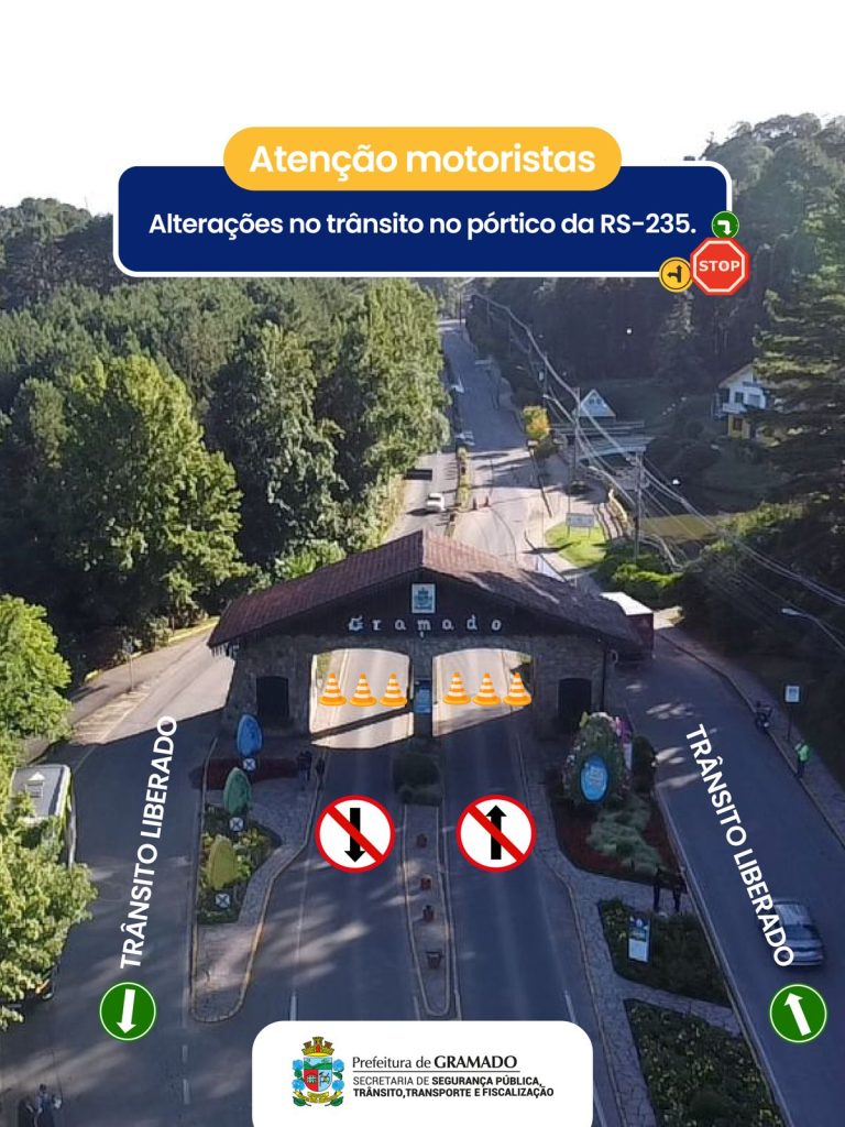 A Administração Municipal de Gramado informa que na manhã desta sexta-feira (10), foi suspensa, de forma temporária, a passagem de veículos sob o pórtico da RS-235. A medida foi necessária após avaliação técnica, que constatou abalo na estrutura devido um acidente registado na noite de segunda-feira (6), quando um caminhão desrespeitou a altura permitida e colidiu contra o pórtico. O fluxo de veículos segue ocorrendo no trecho, pelas vias laterais da estrada.