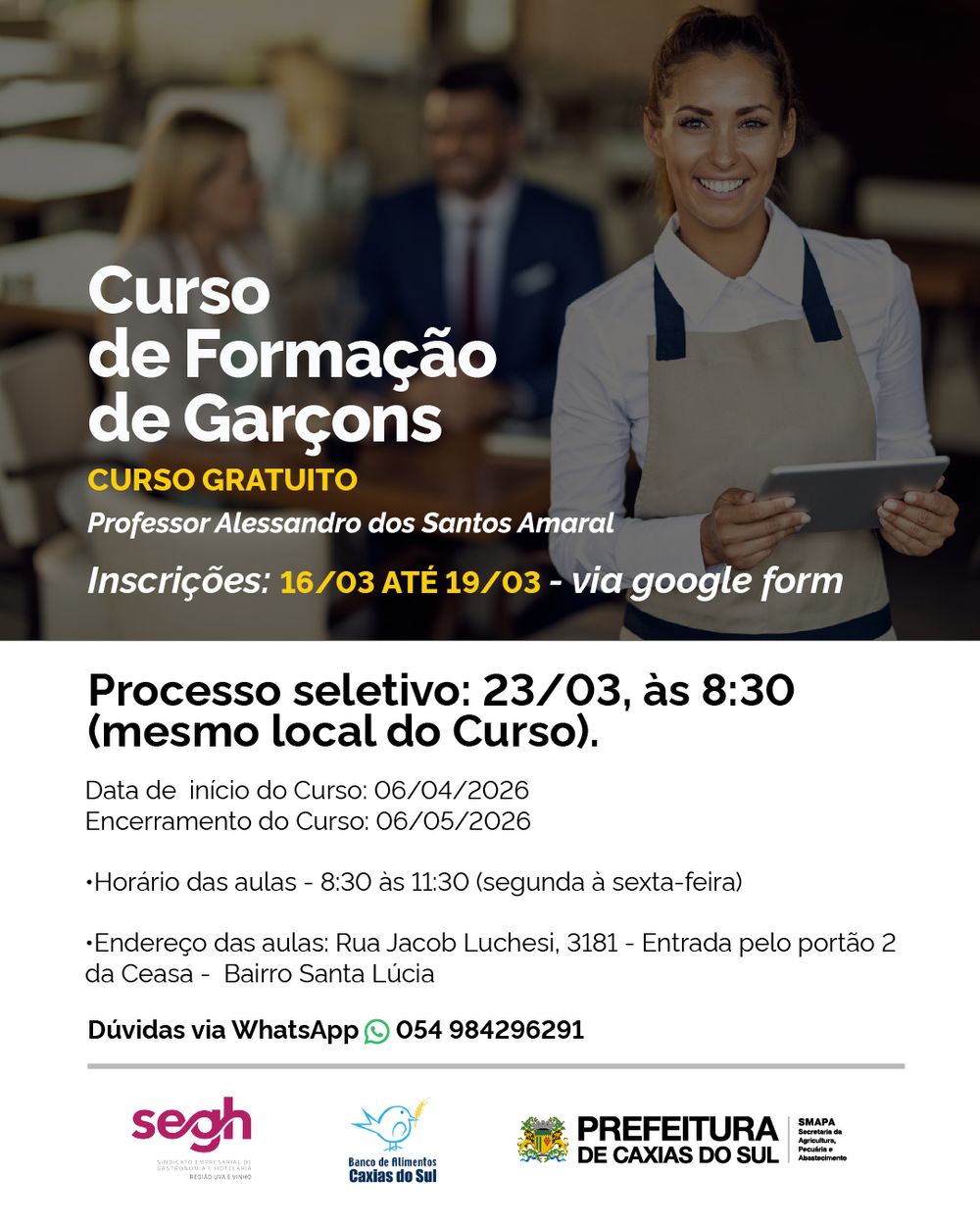 A Prefeitura, por meio do banco de Alimentos da secretaria de Agricultura, pecuária e Abastecimento, está com inscrições abertas para o processo seletivo do curso de Formação de Garçons. É uma oportunidade gratuita de qualificação profissional voltada a pessoas com mais de 18 anos que buscam inserção ou reinserção no mercado de trabalho.