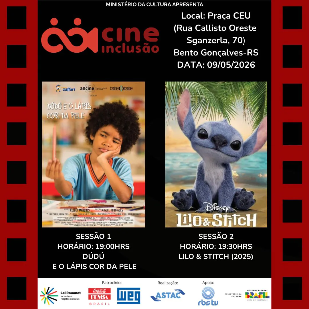 Realizado por meio da Lei Rouanet (Lei de Incentivo à Cultura), o Cine Inclusão tem como objetivo democratizar o acesso à sétima arte. O evento em Bento Gonçalves conta com o patrocínio estratégico da Coca-Cola FEMSA e da WEG, reforçando o compromisso das marcas com projetos sociais e culturais na região.