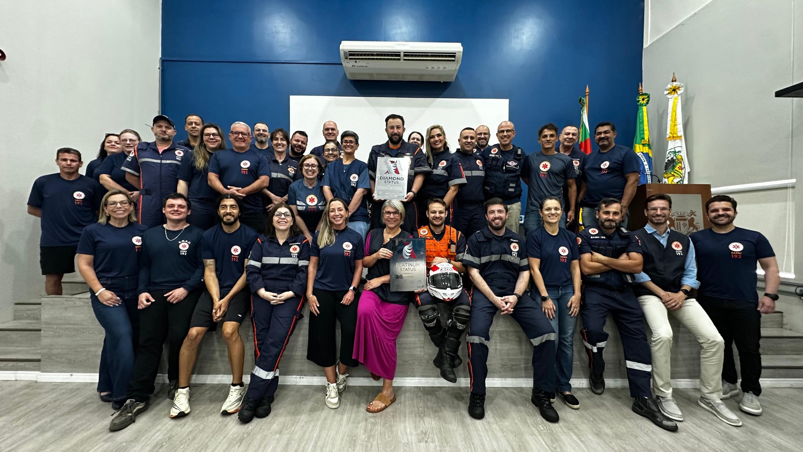 O Serviço de Atendimento Móvel de Urgência Regional de Caxias do Sul alcançou um feito histórico. Na tarde desta quarta-feira (01/04), o SAMU recebeu oficialmente o prêmio EMS (Serviço Médico de Emergência) Angels Awards status Platinum e Diamond, no auditório do Centro Administrativo. A certificação reconhece e homenageia o melhor desempenho em atendimentos de urgência e emergência, especialmente em casos de pacientes com Acidente Vascular Cerebral (AVC), no mundo. Atualmente, dentre as mais de 4 mil bases do serviço no Brasil, somente 27 são certificadas e Caxias do Sul é uma delas.