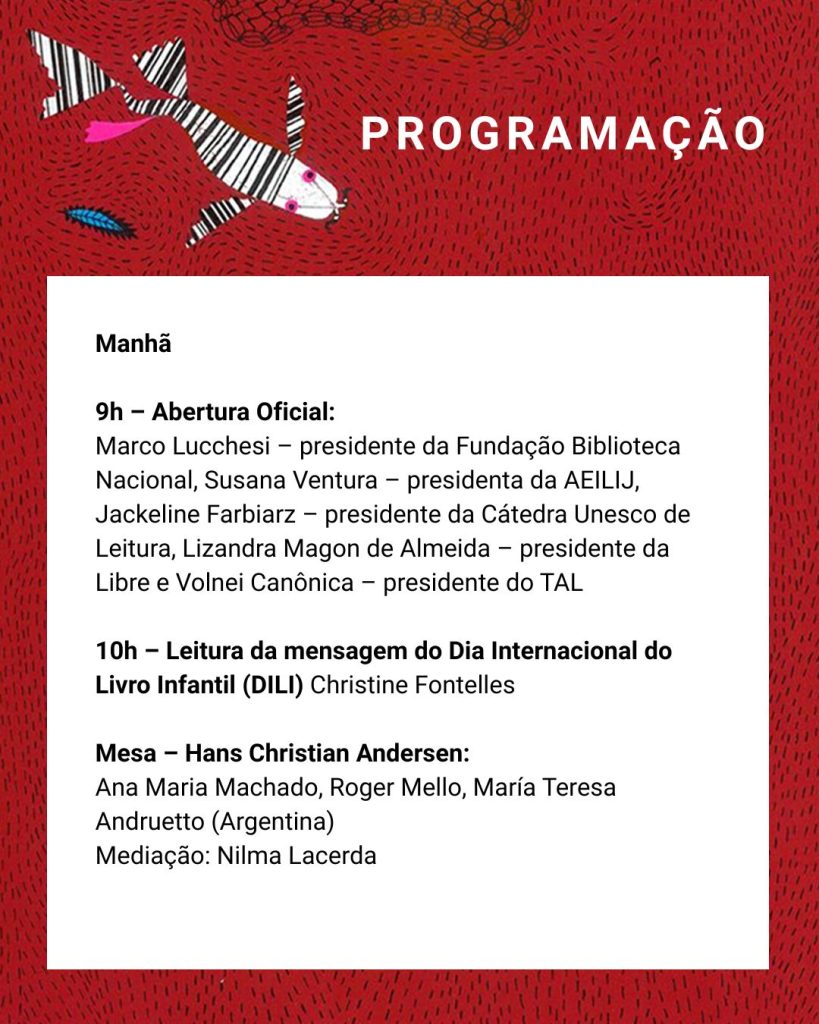 Na sequência, às 10h, será realizada a leitura da mensagem do Dia Internacional do Livro Infantil (DILI), por Christine Fontelles. Ainda pela manhã, a mesa “Hans Christian Andersen” reunirá Ana Maria Machado, Roger Mello e a argentina María Teresa Andruetto, com mediação de Nilma Lacerda. Os convidados foram condecorados com o Prêmio Hans Christian Andersen, considerado o Nobel da Literatura para Crianças e Jovens.