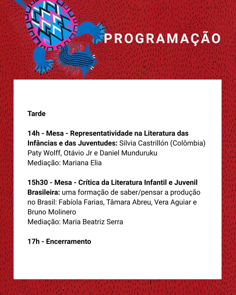 No período da tarde, a programação retoma às 14h com a mesa “Representatividade na Literatura das Infâncias e das Juventudes”, com participação de Silvia Castrillón, da Colômbia, Paty Wolff, Otávio Jr. e Daniel Munduruku, sob mediação de Mariana Elia. Às 15h30, o debate se volta para a “Crítica da Literatura Infantil e Juvenil Brasileira: uma formação de saber/pensar a produção no Brasil”, com Fabíola Farias, Tâmara Abreu, Vera Aguiar e Bruno Molinero, sob mediação de Maria Beatriz Serra.. O encerramento está previsto para às 17h